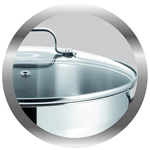 Auf dem Induktionsboden des Kochtopfes befindet sich eine ferromagnetische Edelstahlplatte, die eine ideale Planstabilität und optimale Hitzeverteilung ermöglicht. Neben dem Glasdeckel ist der Topf mit einem ergonomisch geformten genieteten Griff aus Edelstahl ausgestattet. Das Produkt eignet sich für sämtliche Herdarten einschließlich Induktionsherden. Die Backofeneignung erreicht ein Maximum von 175 Grad bei normalem Gebrauch sowie 260 Grad bei Anwendungen ohne Deckel.