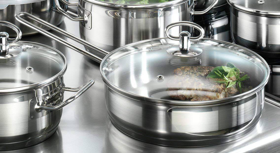 Das Set besteht aus insgesamt zwanzig Teilen. Jeder Kochtopf besitzt einen innovativen Kapselboden und ist somit auch induktionsgeeignet. Die Glas-Deckel besitzen einen speziellen Dampfaustritt, um ein vitaminschonendes Kochen zu garantieren. Das Set umfasst eine Stielkasserole mit 14 cm Durchmesser, drei Kochtöpfe mit jeweils 16, 18, 20 und 22 cm Durchmesser, eine Schmorbraten-Pfanne mit 22 cm Durchmesser sowie vier verschließbare Edelstahlschüsseln in den Größen 12, 15, 18 und 20 cm Durchmesser.